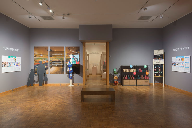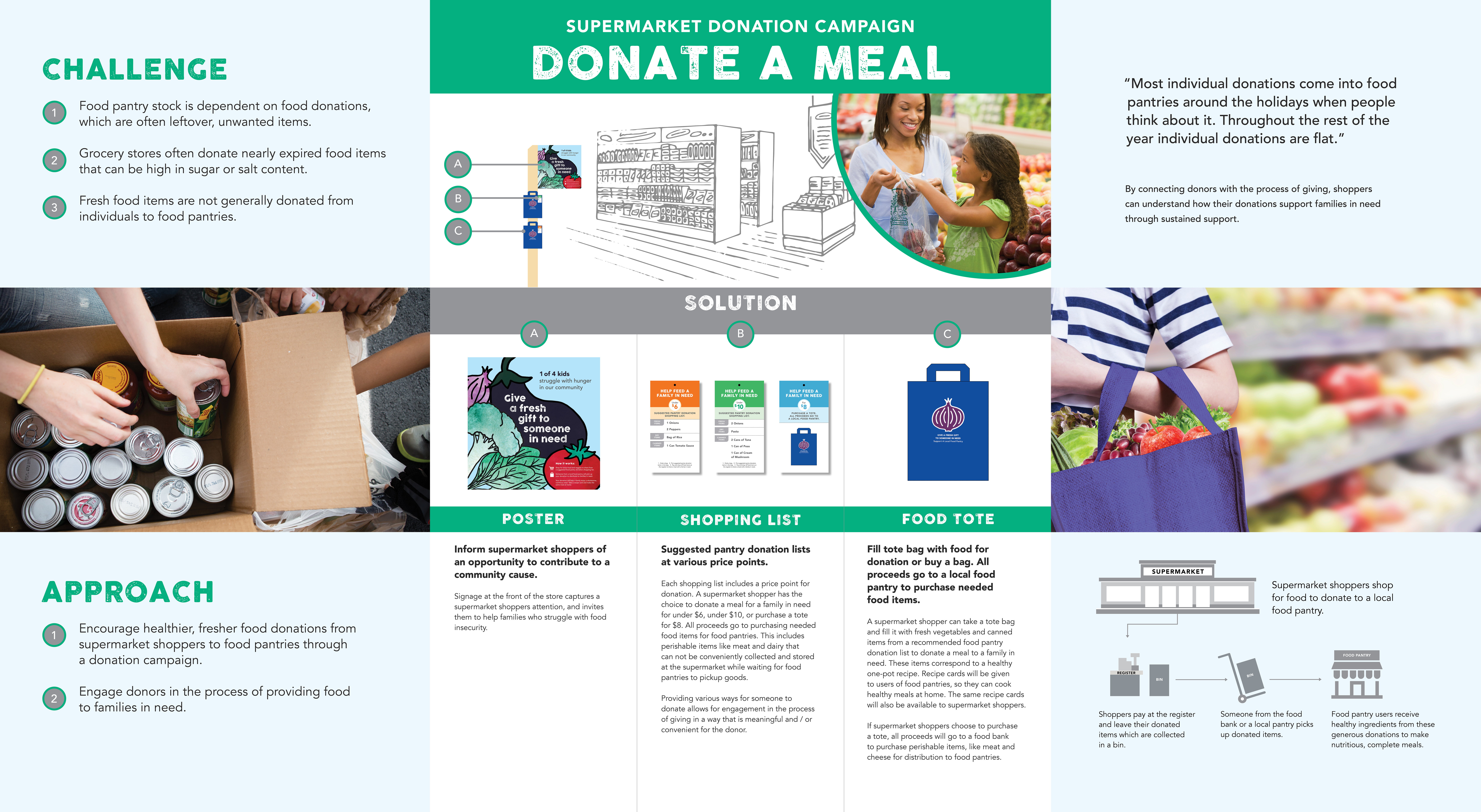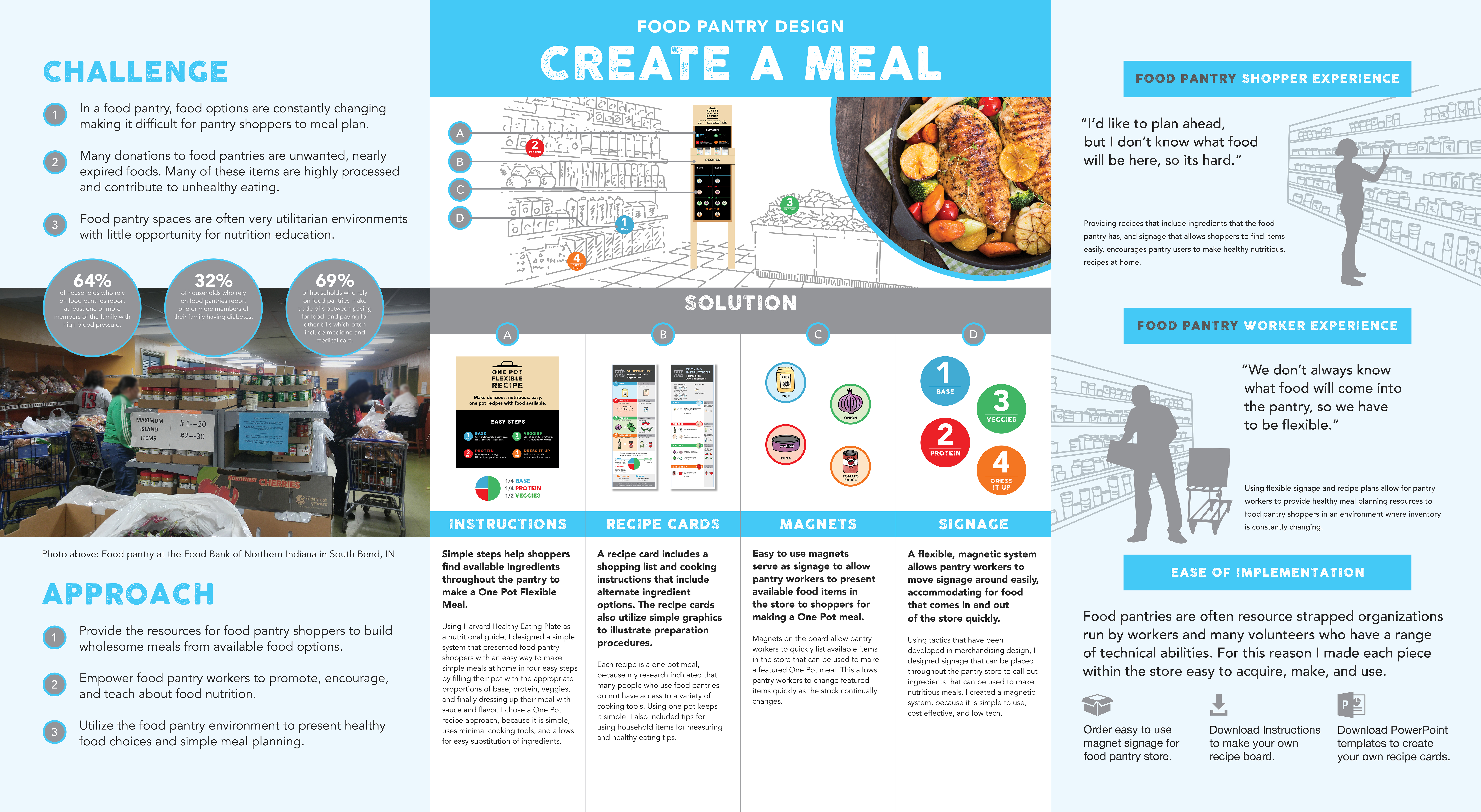 Many people who rely on food pantries have diet related health issues such as high blood pressure and diabetes. Food items coming into food pantries are often limited and change frequently. Current food donations to pantries frequently include highly processed canned items, and nearly expired food from grocery stores such as chips, cakes, pastries and other items with high sugar and salt content. This project shows the research and design solution that 1) Give food pantry shoppers the tools to make healthy meals out of food pantry options, and 2) Encourage healthier, fresher food donations to food pantries through a donation campaign to support the success of the first goal. To support healthy meal planning for clients of food pantries I designed a system that includes: providing food pantry shoppers flexible, nutritious, recipes that are simple to cook and understand, signage to call out and navigate shoppers to healthier food items within the pantry store, and tools for pantry workers to change and share recipes quickly to accommodate for food available in the food pantry space.